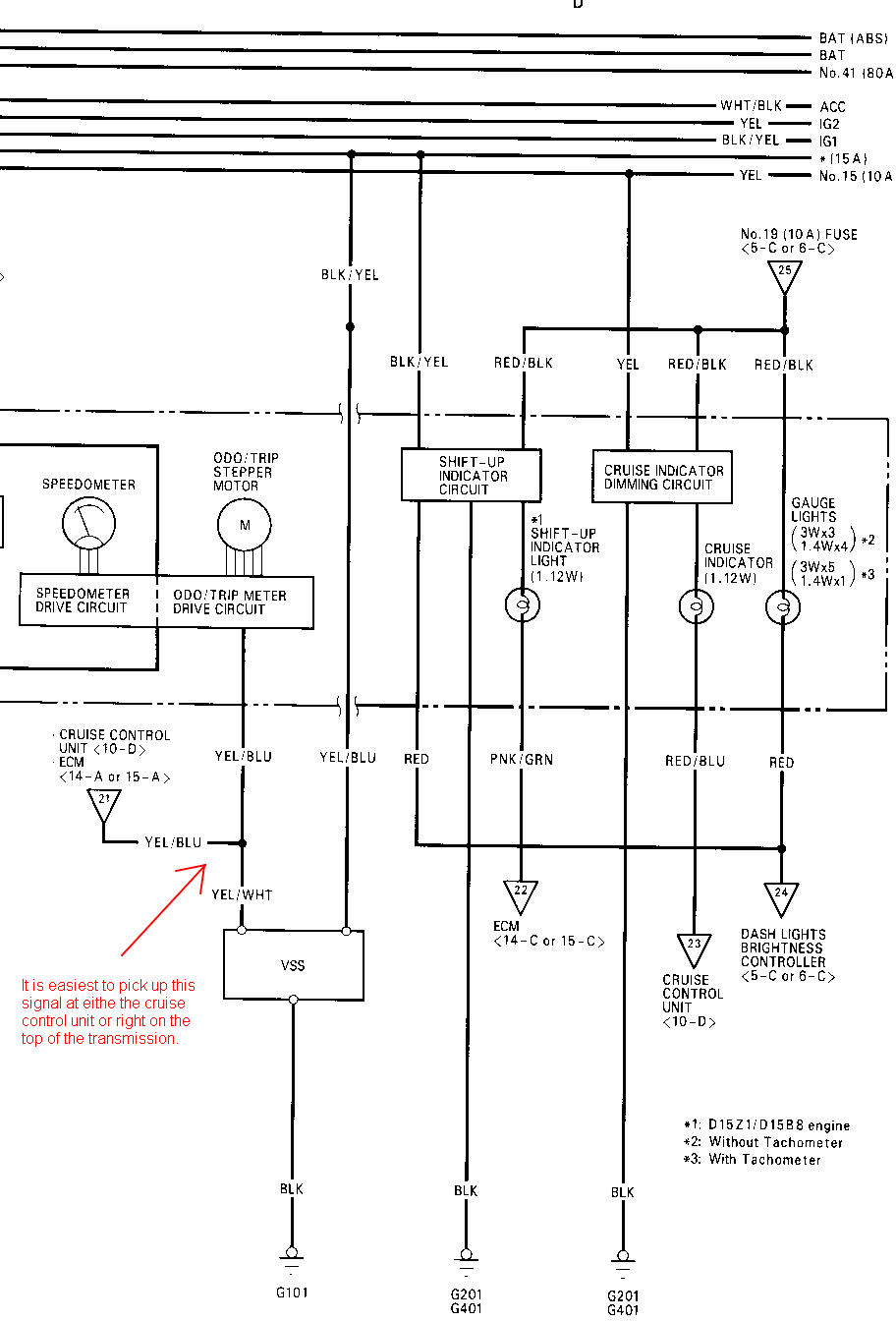 What follows are several wiring diagrams of compatible vehicles marked with the correct location to tap the VSS for use with your ALFA. Your vehicle will have a similar diagram, and you should refer to it carefully before making any connections. These diagrams are large (for clarity) - please be patient while they load.